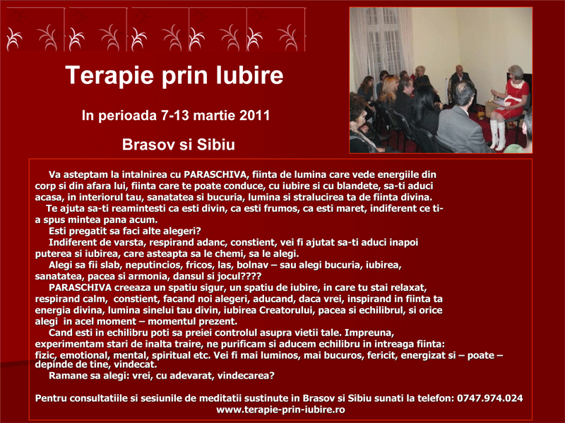 Pentru consultatiile si sesiunile de meditatii sustinute in Brasov si Sibiu sunati la telefon: 0747.974.024